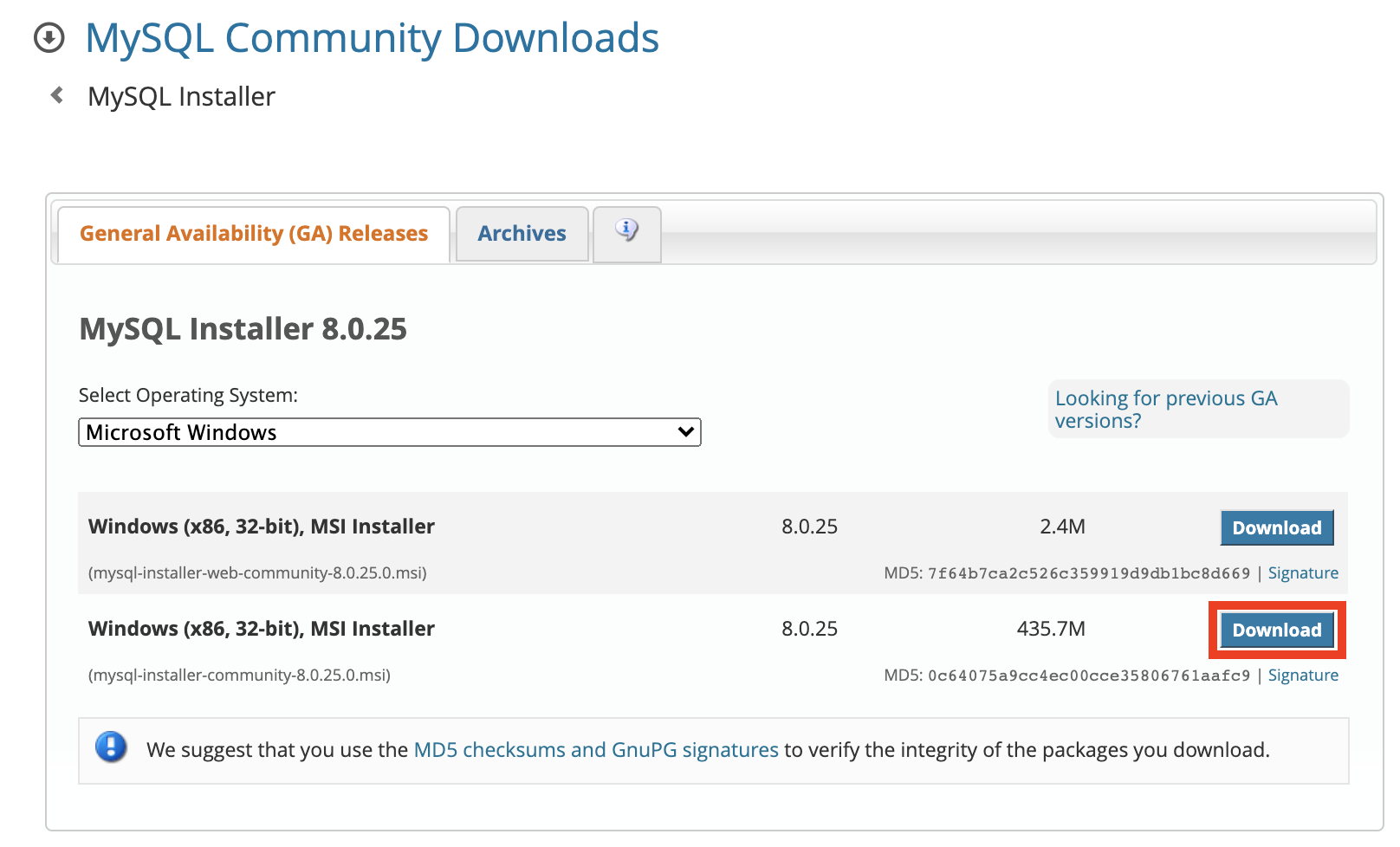 5) Windows (x86, 32-bit), MSI Installer Download 클릭