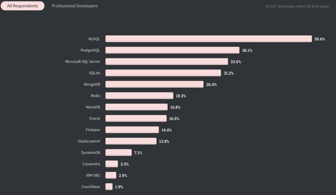 Stack Overflow 2020 Developer Survey에서 가장 인기있는 DBMS에서 당당히 1위를 한 MySQL을 다뤄볼 예정입니다.