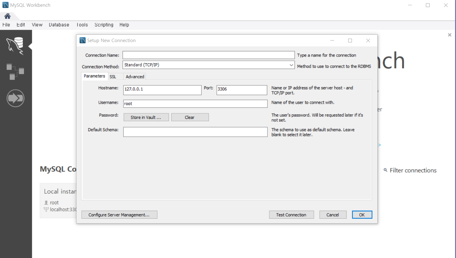 참고) MySQL Connections 옆 + 아이콘을 클릭하면 아래처럼 새롭게 connection을 할 수 있다.