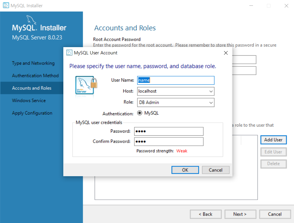13) Add User 버튼을 클릭하여 User Name을 설정하고 password를 입력(잊어버리지 않도록 주의)